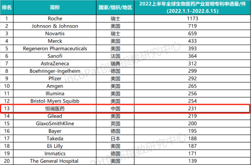 近日,全球专利数据库incoPat创新指数研究中心发布全球生物医药发明专利TOP100榜单,九游会j9医药以上半年231件发明专利申请量位列榜单第13名,是唯一一家进入TOP20的中国药企。