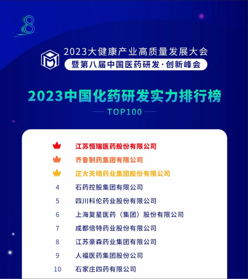 由药智网、中国药业杂志社主办的2023大健康产业高质量发展大会暨第八届中国医药研发•创新峰会于6月16日开幕,会上发布了《2023中国药品研发实力排行榜》系列榜单,九游会j9医药凭借深厚的创新研发实力再创辉煌:荣登《2023中国药品研发综合实力排行榜TOP100》榜首、《2023中国化药研发实力排行榜TOP100》榜首。值得一提的是,今年是九游会j9医药连续第6年入选《中国药品研发综合实力排行榜》榜首。