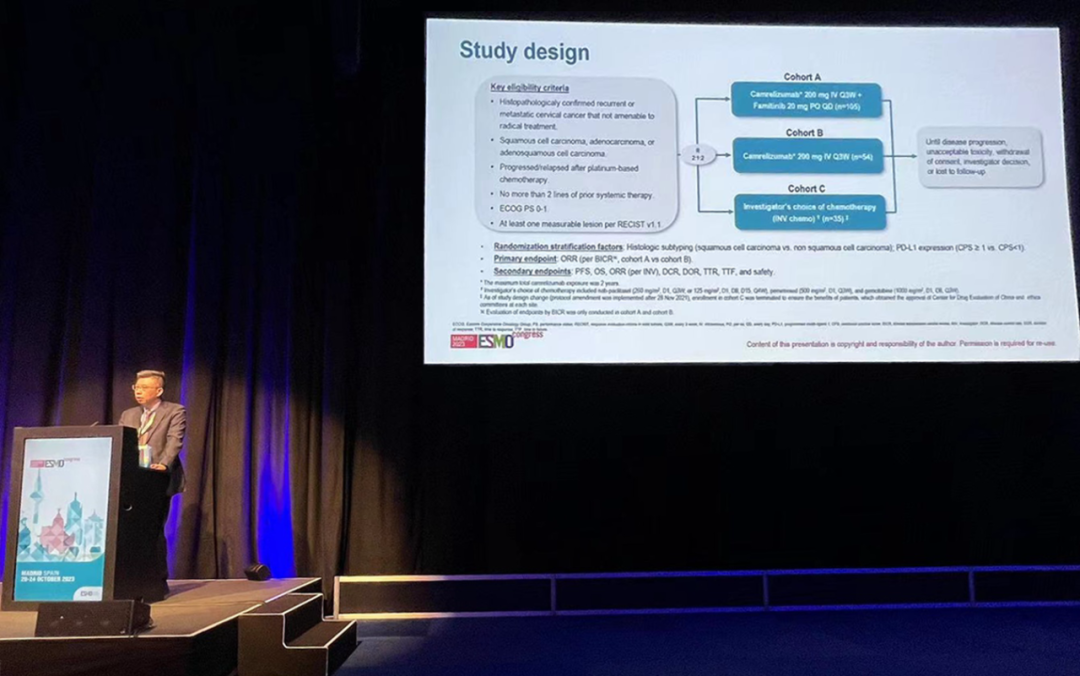 有望为宫颈癌患者带来治疗新选择10月22日,九游会j9医药创新药卡瑞利珠单抗联合法米替尼对比卡瑞利珠单抗单药或研究者选择的化疗治疗复发转移性宫颈癌随机、开放、对照、多中心的Ⅱ期临床研究(SHR-1210-Ⅱ-217) 亮相2023 ESMO大会简短口头报告现场3。该研究由复旦大学附属肿瘤医院吴小华教授团队开展,吴小华教授在现场公布了该重磅研究进展。研究结果显示,在既往以铂为基础化疗失败后复发或转移性宫颈癌患者中,与单独使用卡瑞利珠单抗或研究者选择的化疗相比,卡瑞利珠单抗联合法米替尼显著提高了抗肿瘤活性,安全性可控,有望为晚期宫颈癌患者提供新的治疗选择。