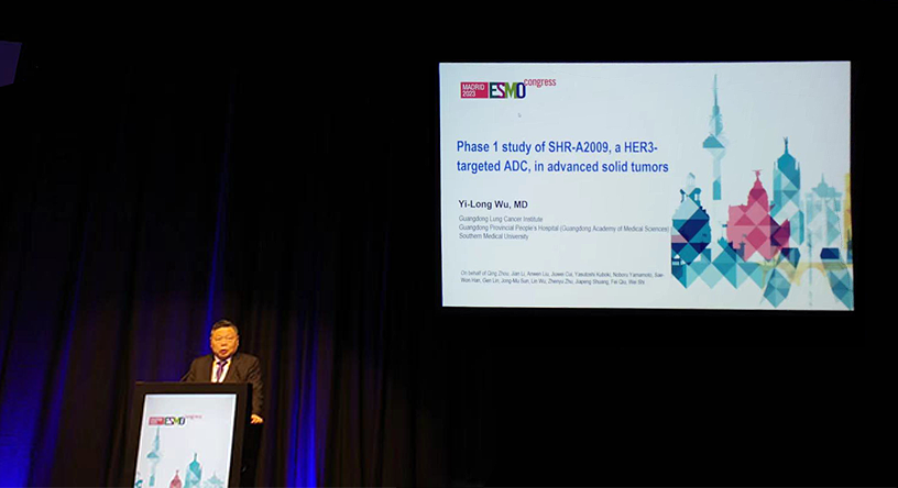 10月23日,九游会j9医药创新药、HER3靶向ADC药物SHR-A2009治疗晚期实体瘤的I期研究亮相2023 ESMO大会简短口头报告现场5。该研究由广东省人民医院的吴一龙教授牵头开展,吴一龙教授在现场公布该研究的重要进展。研究结果显示,SHR-A2009在经治晚期实体瘤患者中显示出可控的安全性和令人鼓舞的抗肿瘤活性。目前评估更高剂量的SHR-A2009在选定癌症类型(NSCLC和其他实体肿瘤)中作用的试验正在进行中。